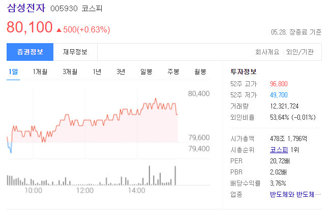 전날보다 0.63% 상승하며, 겨우 8만 원 대를 회복했습니다.
