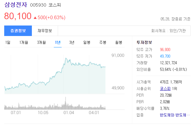 삼성전자의 지난 1년간 주가 흐름을 보면