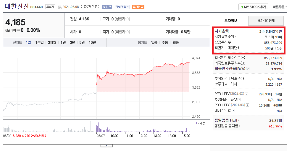 주가 급등과 더불어 대한전선은 어느새 시가총액 3조 5,000억 원으로 코스피