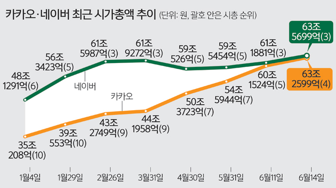 지난해 말부터 카카오는 빠른 속도로 네이버의 시가 총액을