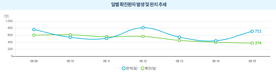 지난주에는 6/10 목요일 하루를 제외하고 400~500명 대의 코로나 19 확진자