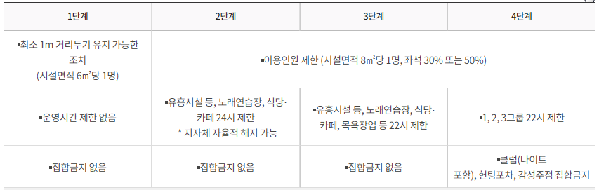 않고, 2단계에서는 100인, 3단계에서는 50인 이상 금지, 마지막 4단계에서는