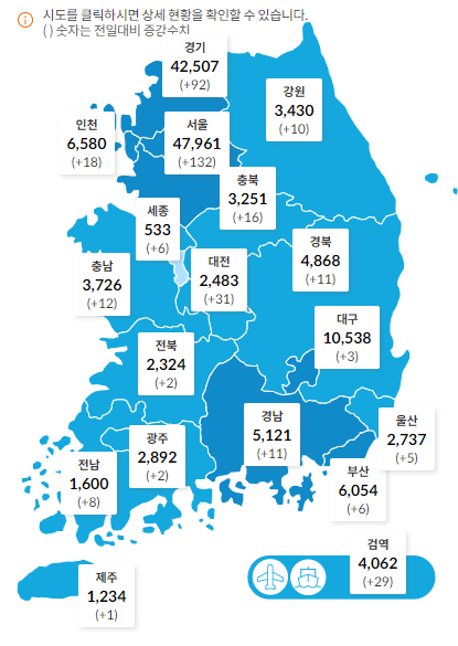 만약 오늘 기준으로 지역별 확진자 수를 보면
