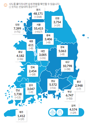 그렇다면 지역별(시도별) 코로나 19 일일 확진자 수를 확인해 볼까요?