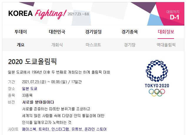 도쿄 올림픽은 내일 7/23일부터 8/8까지 17일간 펼쳐질 예정이고,
