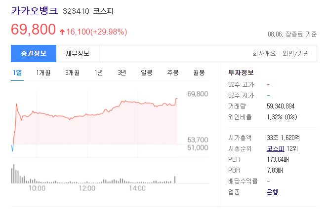 위에서도 보셨겠지만 카카오 뱅크는 오늘 6만 9,800원으로 장을 마감했는데요,