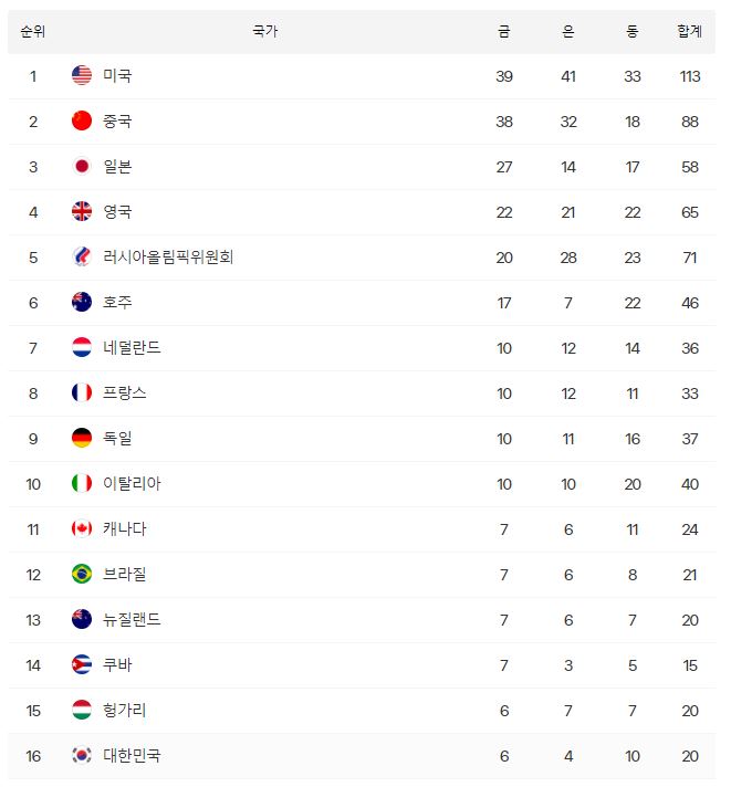 이번 도쿄 올림픽은 종합 1위는 금메달 39개를 획득한 미국이 차지했습니다.
