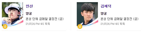 - 양궁의 안산 선수는 우리나라 올림픽 사상 최초로 금메달 3개를 획득하며