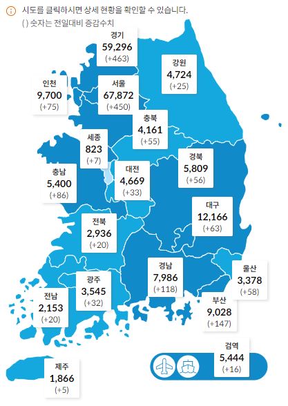 코로나19 지역별(시도별) 확진자 수