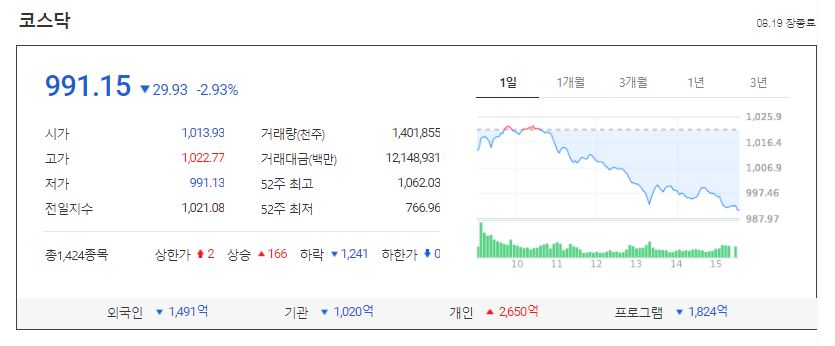 코스피뿐 아니라 코스닥도 2.93% 하락하며 1,000선이 깨졌습니다.