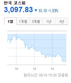 장 마감 기준으로 코스피가 61.1포인트 1.83% 하락하며 3,097 포인트로 마감했고,