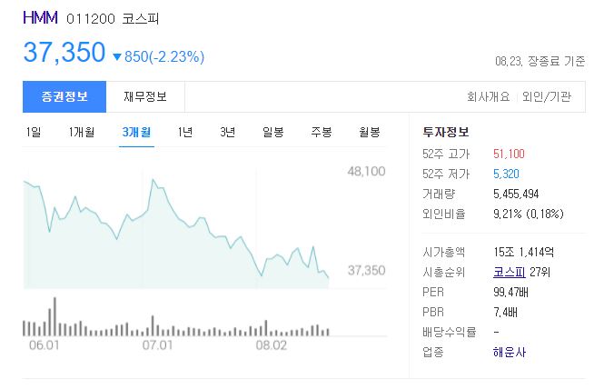 HMM의 주가는 전날보다 약 2.2% 하락하며 3만 7,350원에 장을 마감했습니다.