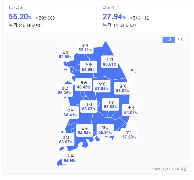 현재 우리나라 코로나19 백신 접종률은 1차가 드디어 50%를 넘었는데요.