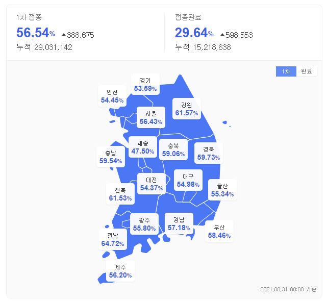오늘 8월 31일 기준으로 코로나19 백신 접종률은 1차가 약 56%, 2차 (접종 완료)가 29%를