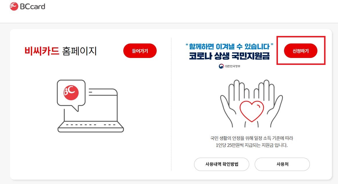 따라서 BC카드 홈페이지에 가서 상생 국민 지원금을 신청했습니다.