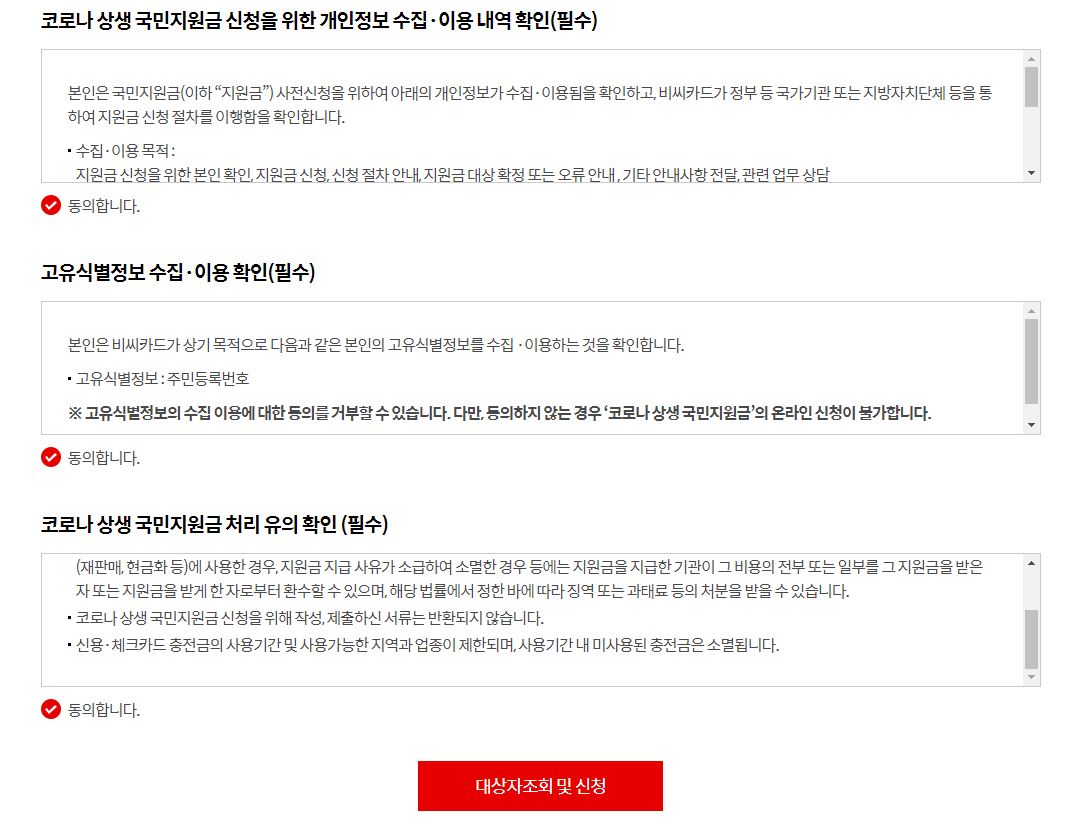 개인정보 수집, 그리고 유의사항에 대한 동의 후에 [대상자 조회 및 신청] 버튼을 누르면 끝입니다.