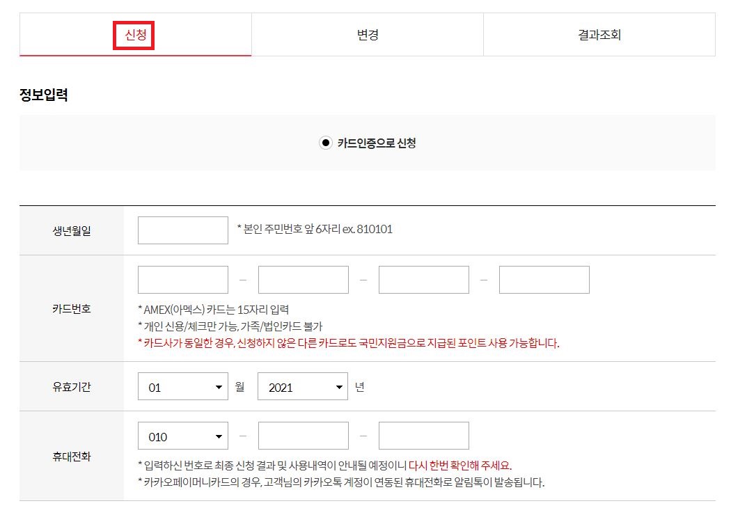 [신청] 페이지에서 생년월일, 카드번호, 휴대전화 번호 등 개인 정보를 입력하고,