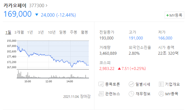 먼저 11/4 장 마감 기준으로 카카오 페이의 주가를 볼까요?