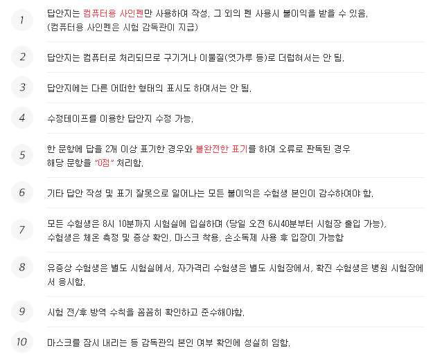 수능시험 시 유의사항에는 한국 교육과정 평가원에서 제시한 10가지 항목이 있는데