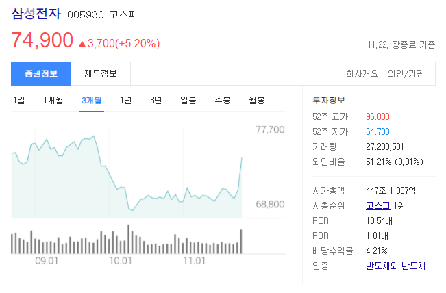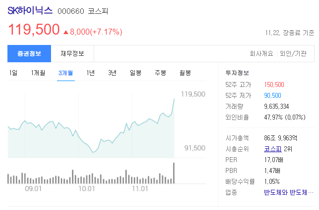 오늘(11/22) 장 마감 기준으로 삼성전자와 SK하이닉스의 주가가 껑충 뛰어올랐습니다.