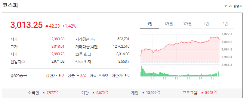 코스피 지수 역시 다시 3,000포인트를 넘어섰습니다.
