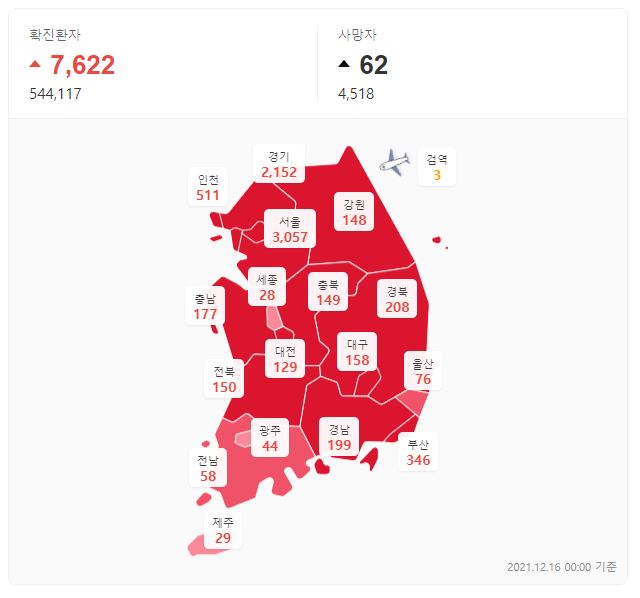오늘 12/16 기준으로 코로나19 확진자는 7,600명을 넘어섰고, 사망자는 62명입니다.