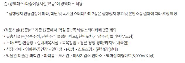 - 다중 이용시설 15종 방역 패스 적용 (상세 내용은 아래 표 참고)