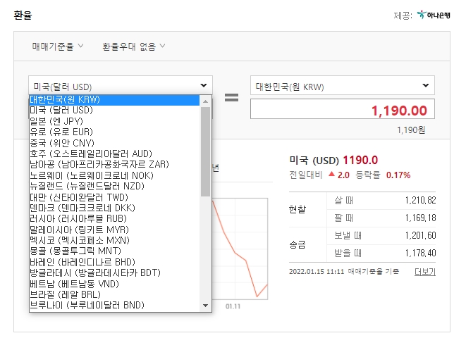 현재 단순히 달러/원 환율을 보면 1달러에 1,190원(1/15 기준)이지만 달러를 살 때는