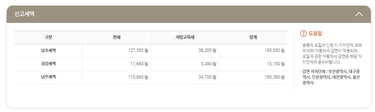 본인 차량 정보를 확인하고 나면 본인이 납부해야 할 신고세액이 상세히 게산되어 나오는데요,