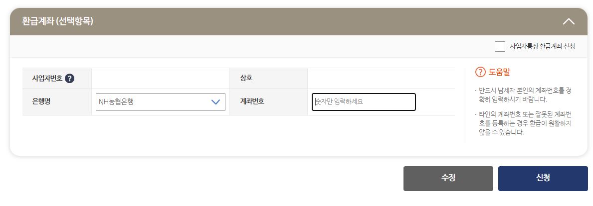 마지막으로 환급계좌(선택항목)를 입력한 후 신청을 누르시면 자동차세 연납 신청 절차가