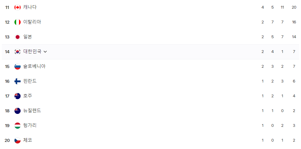 우리나라는 현재 금메달 2개, 은메달 4개, 동메달 1개로 종합 14위에 올라있습니다.