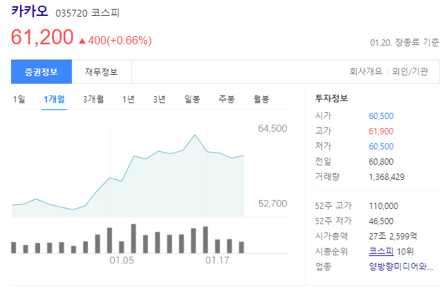 카카오의 주가는 1/20 장종료 기준으로 61,200원을 기록하고 있습니다.