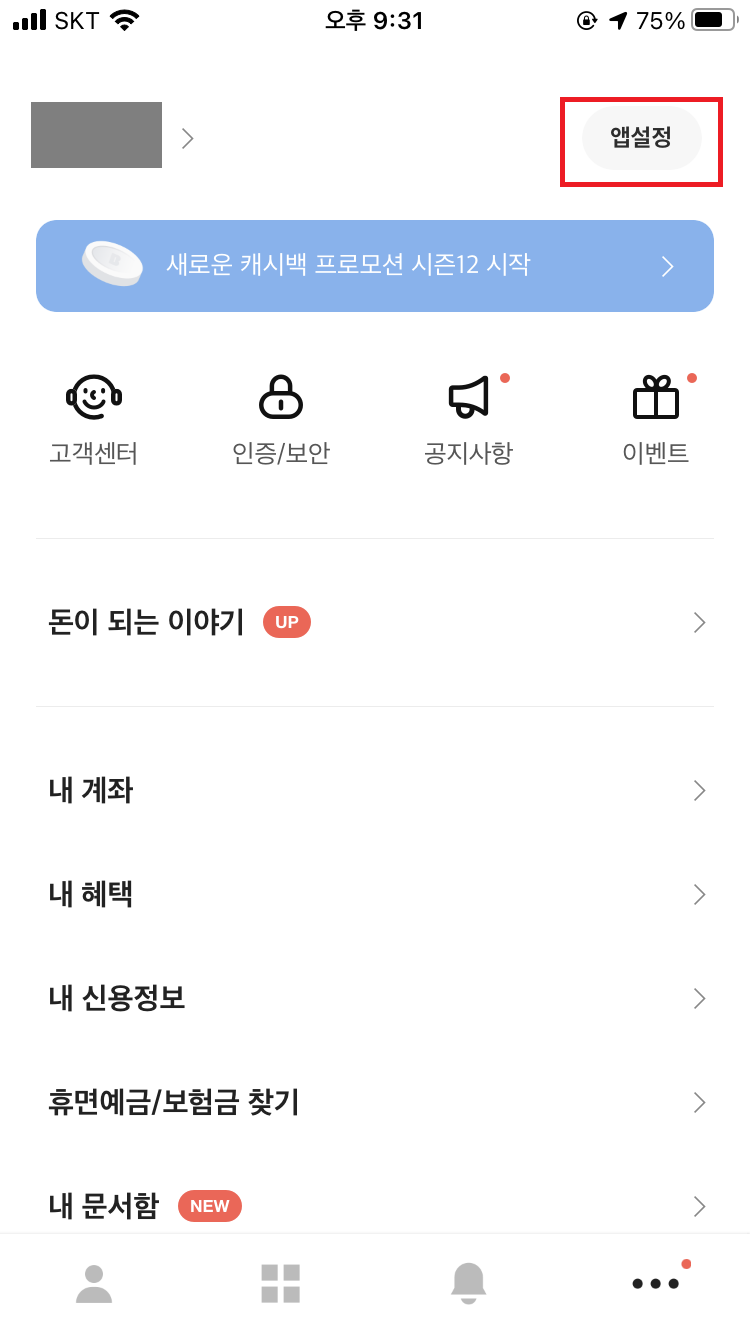 카카오뱅크 앱 관리창에서 우측 상단에 [앱설정]으로 이동해 주시고,