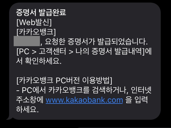 카카오뱅크 홈페이지에서 [고객센터] - [나의 증명서 발급 내용]으로 이동해 주세요.