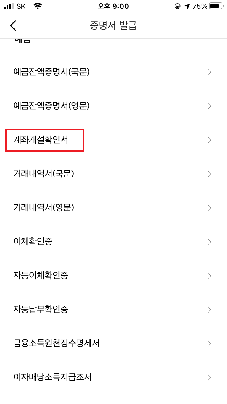 고객센터에서 증명서 발급 선택, 증명서 발급에서 [계좌개설확인서]를 클릭해 주시고,