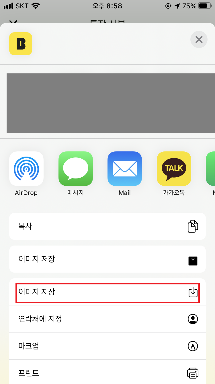 위 사진에 표기된 것처럼 이미지 저장을 누르시면 통장 사본이 사진폴더에 저장이 되고,