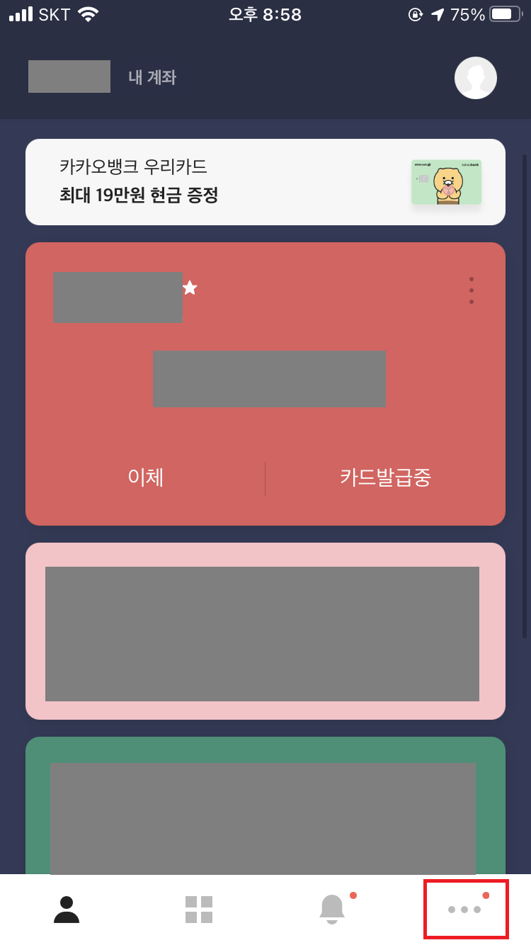 카카오뱅크 앱에 들어가셔서 이번에는 계좌를 선택하는 것이 아니라