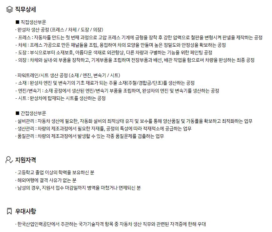 지원 자격과 절차는 이렇게 간단하게 나와있지만, 구체적인 내용은 그간 기사에서 나오거나 많은 사람들이 전달한 내용이 더 상세하지 않나 생각이 됩니다. 저 역시 현대자동차 생산직 채용에 대한 포스팅을 작성했는데요, 아래 포스팅을 참고하시면 더 상세하고 세부적인 채용절차를 확인할 수 있습니다.