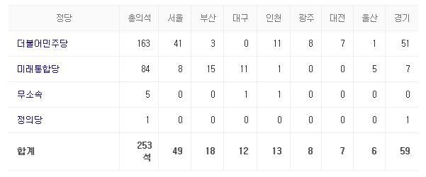 비례대표를 포함해서 정당별 의석수를 보면 총 300석 중에